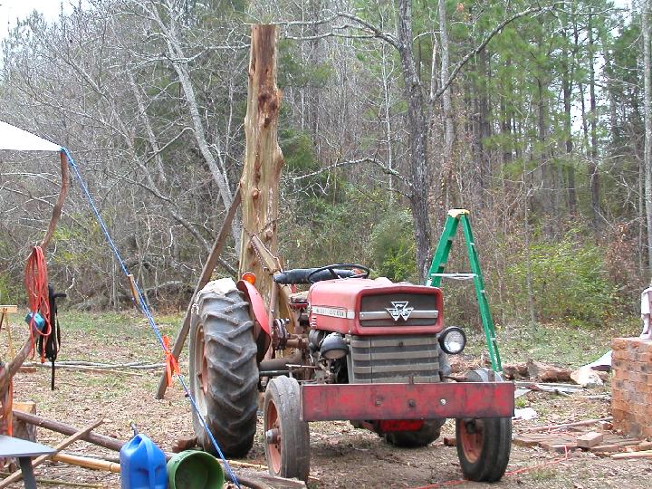 | My trusty tractor! Hooked the boom to the tree trunk and lifted it as high as I could. Then got off and built a crossbrace underneath, moved the tractor to the other side (where it is now) and backed it to where it touched the trunk about half way up. Hooked the chain around it and snugged it up then drove forward and lifted the boom as I went. Set in place as nice as anything! | |