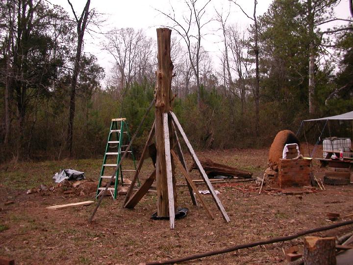 | More bracing up and tractor out of the way. That is a 7 foot ladder to the left. Pole is 12' 2" tall. White 2x4 bracing is about 8 feet long. | |