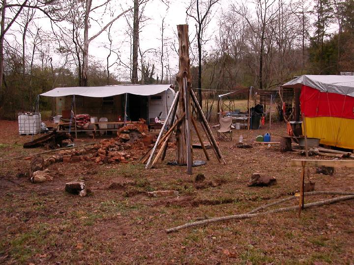 | Looking east with most of the post piers in place. You can see a dark line on the ground to the bottom right, this is where we started digging the high side drainage ditch to carry water away from rather than into the building. A lot more got done but night came over before I got pix. | |