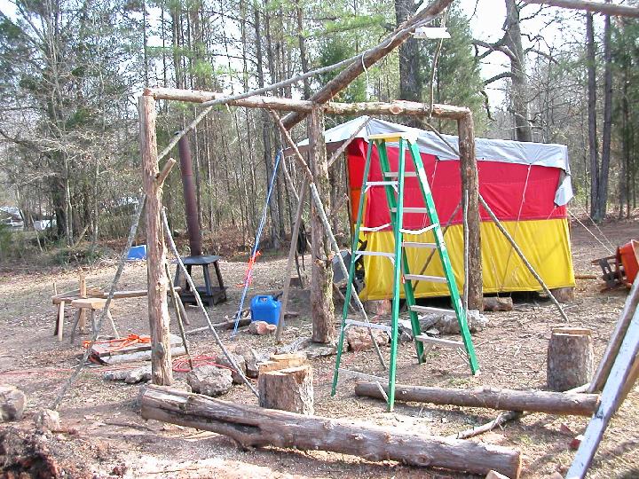 | Inside looking at the new wall. Pine logs standing on end have v shaped cuts made in the top to hold poles being worked on. | |