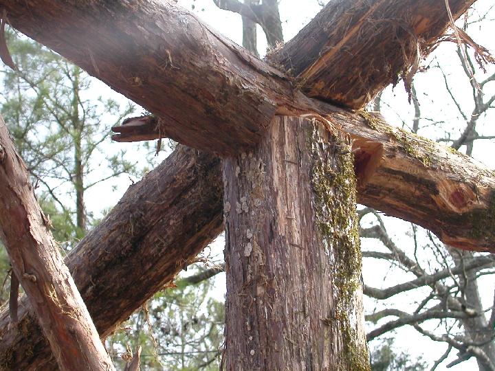 | Close up of the first rafter, pole, header joint. 3 6 inch spikes holding it all together. One in each header end and one in the rafter. | |