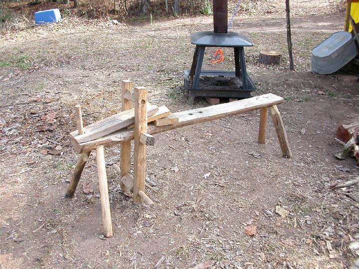 | Shaving horse with firepit in background. | |